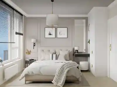 Mieszkanie przy ulicy Chlebowej w Gdansku to nowy apartament deweloperski o powierzchni okolo 65 m². Klienci szukali wnętrza, które łączy współczesną estetykę z codziennym komfortem dla dwóch osób pracujących zdalnie. Kluczowym wyzwaniem był otwarty plan salonu z kuchnią i jadalnią — przestrzeń miała być lekka i spójna, ale z czytelnym podziałem na strefy.
