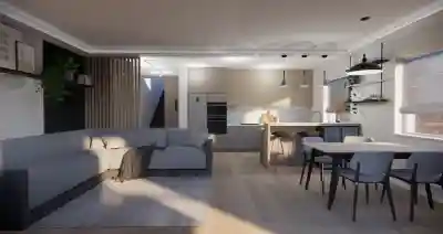 Kolejny projekt otwartej strefy dziennej, ale z zupełnie innym podejściem do atmosfery. Klienci szukali wnętrza ciepłego i przytulnego — z wyraźnym podziałem na strefę kuchenną i wypoczynkową, ale bez fizycznej ściany między nimi. Na 52 m² trzeba było pomieścić pełnowymiarową kuchnię ze strefą gotowania, jadalnię na cztery osoby i wygodny salon z sofą i telewizorem.